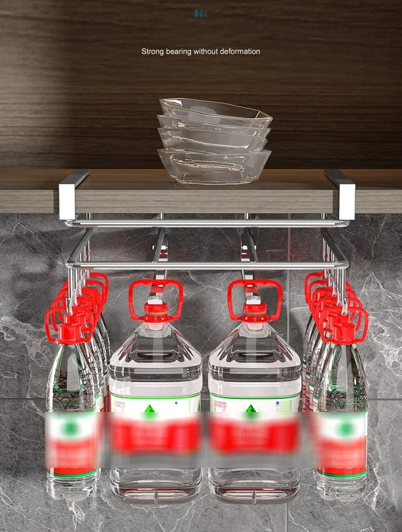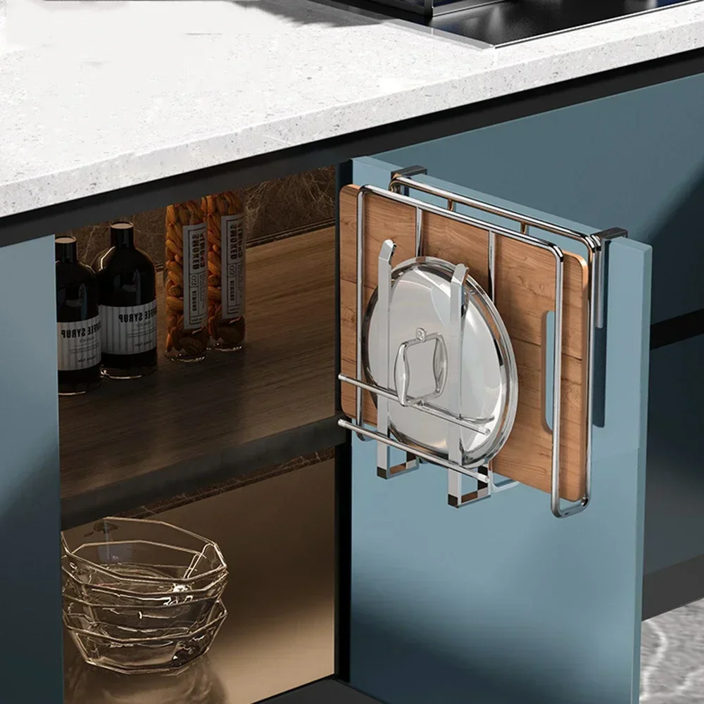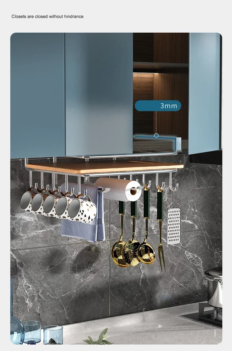 - 3. Se puede instalar horizontal o verticalmente para ahorrar espacio. El panel de la puerta colgante se puede utilizar para almacenar tablas de cortar, tapas de ollas y otros suministros.