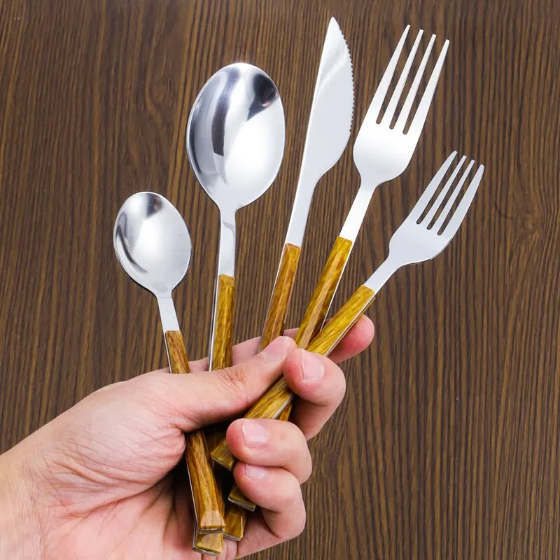 Juego de cubiertos de acero inoxidable con mango imitación de madera